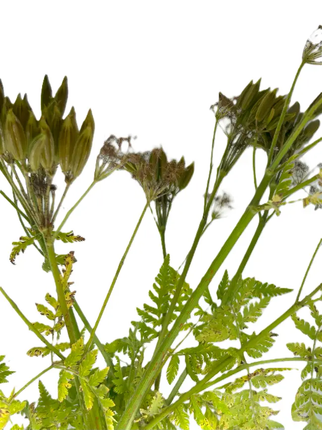Often misspelled online as “sweet Chivas,” sweet cicely is a wild Scottish herb that thrives along hedgerows, fields, and riverbanks. We forage it on ground tied to the ancestral hunting routes of Robert the Bruce, keeping our craft rooted in place and season.