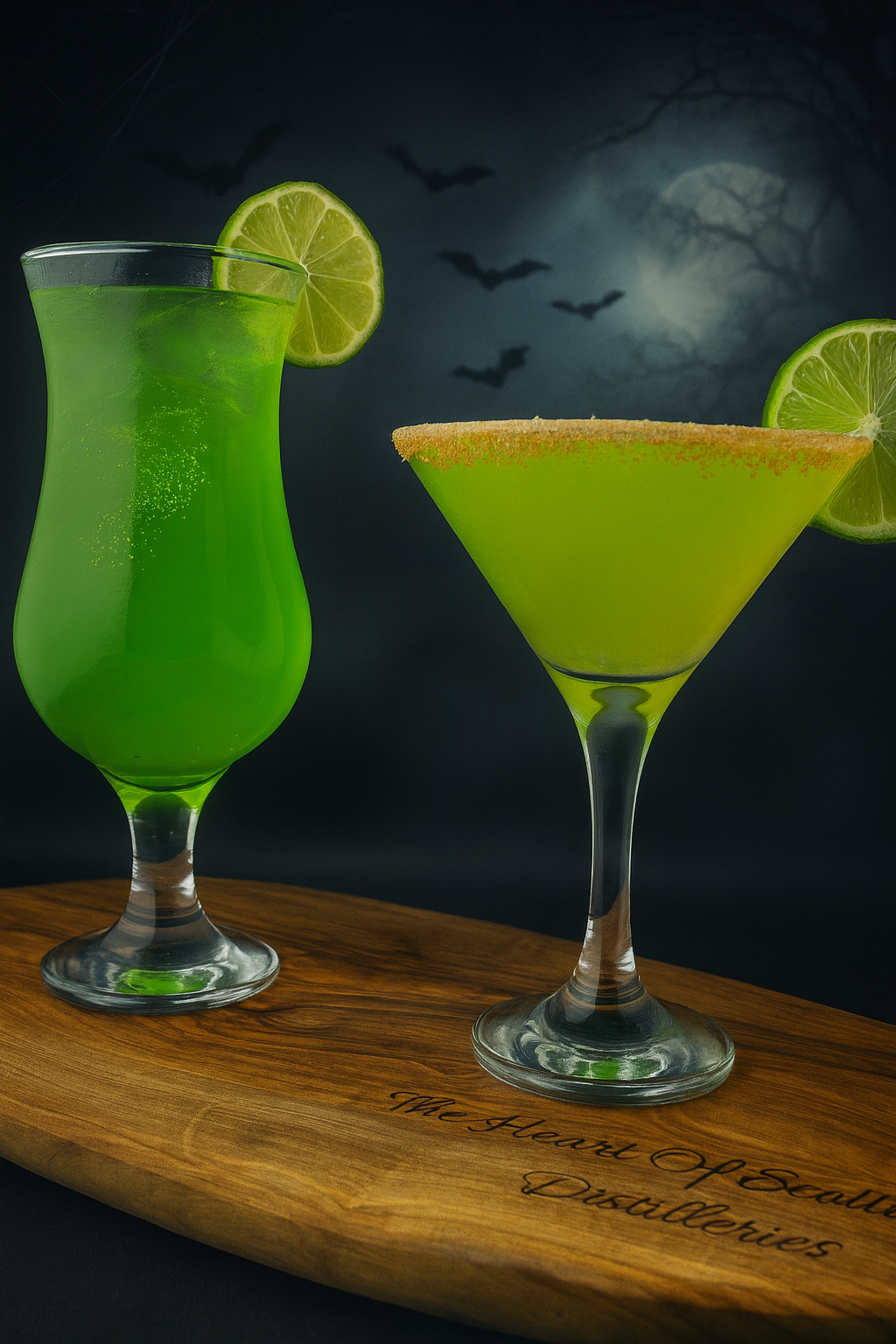 - Neon-green melon gin sour built with Midori and fresh lime; aquafaba/egg white creates that Halloween pale froth.