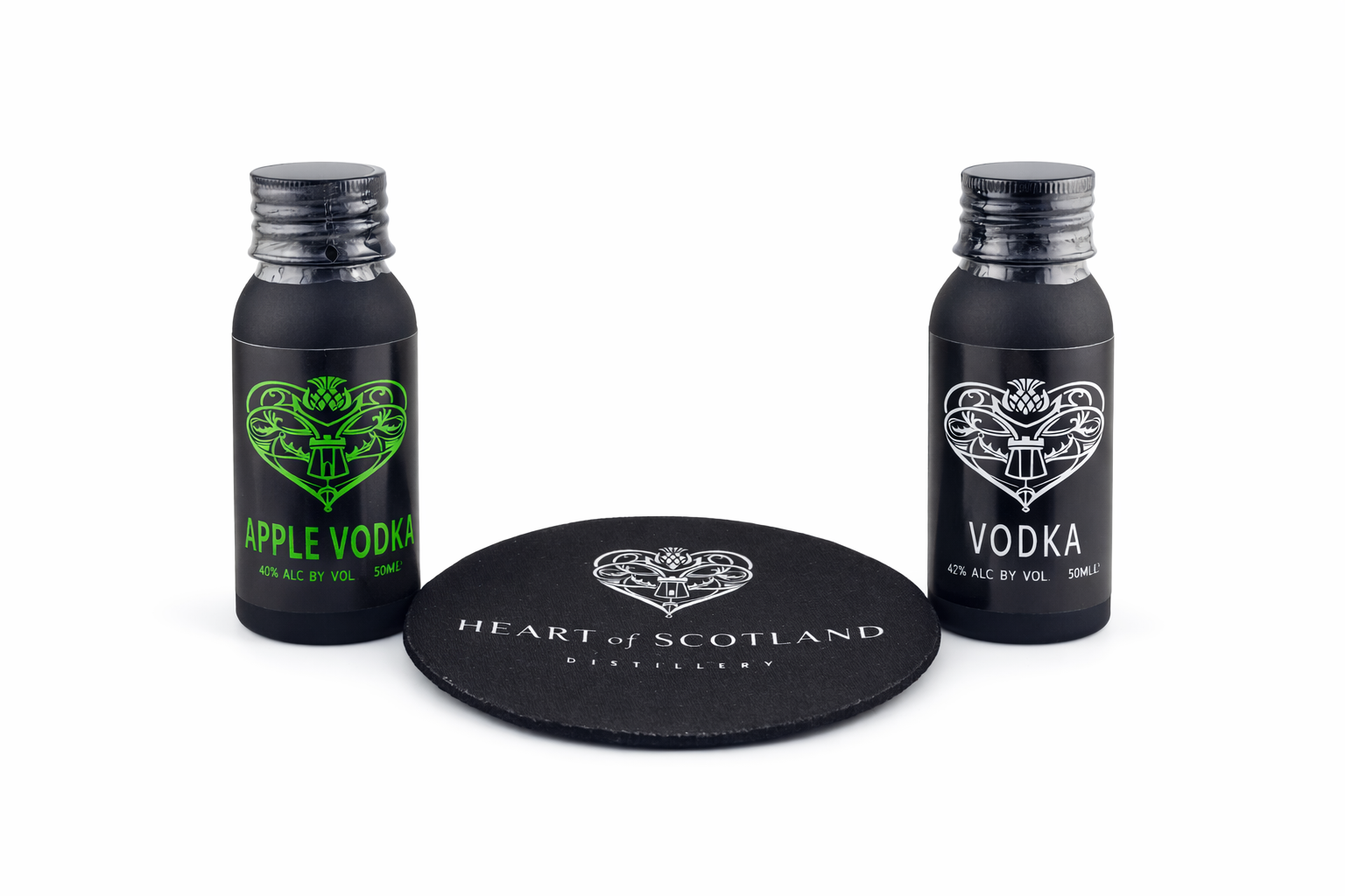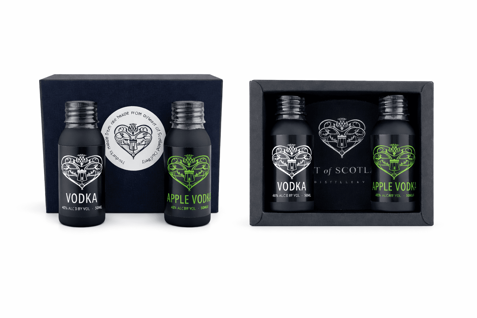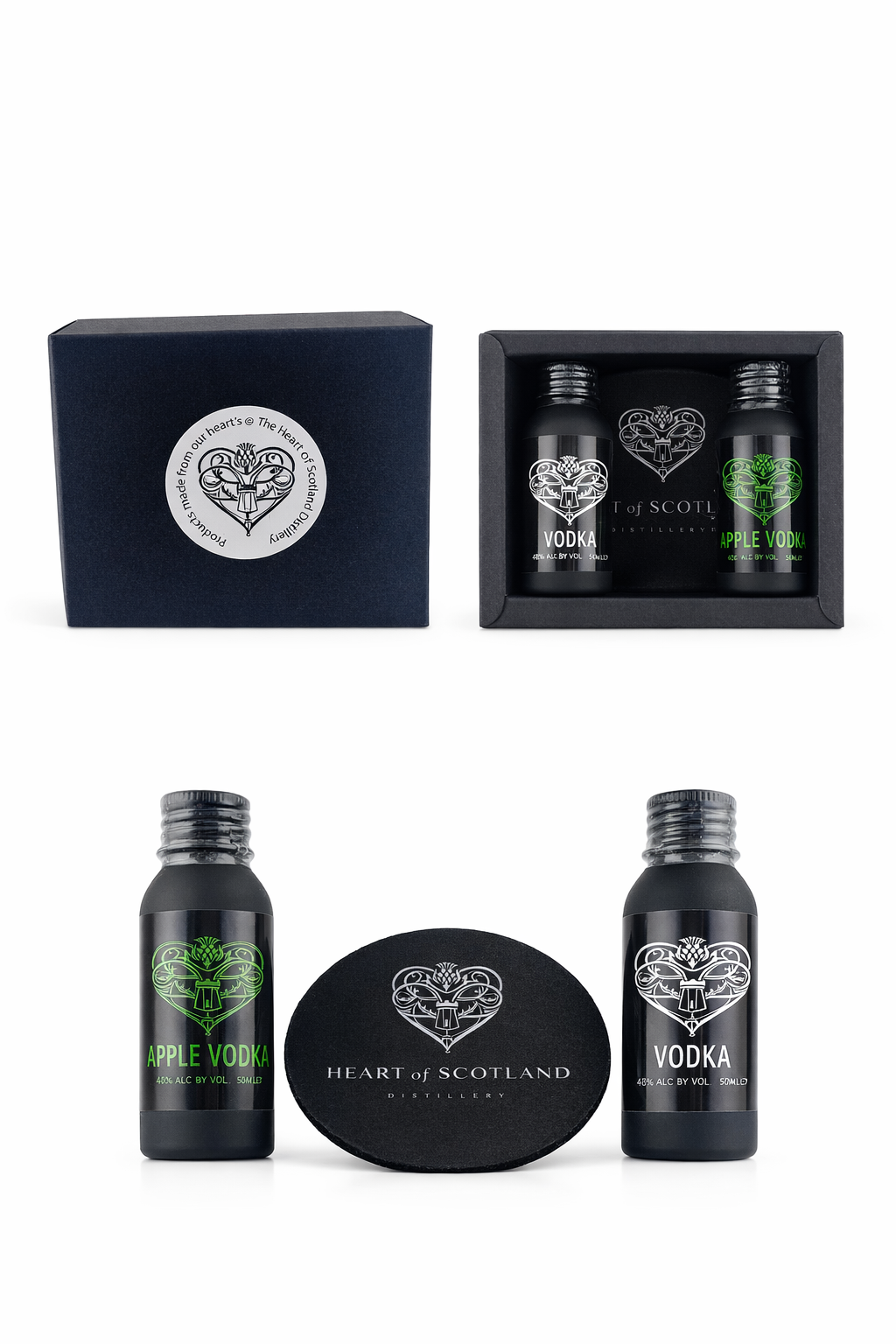 The Heart of Scotland Vodka Gift Set brings together two small-batch Scottish vodkas — one pure and classic, the other fresh with natural apple character — presented in a premium gift box with our branded coaster.